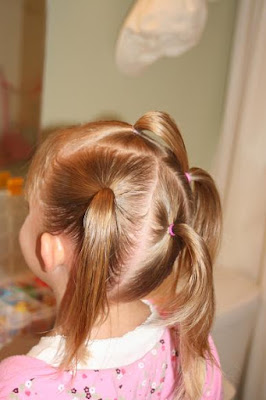 Start by pulling the hair into little triangle ponytails. With Tess, I started on either side of her bangs and went to her crown, then from that ponytail (and the one on the other side) I went just beneath the ear. What was left, was one more ponytail...like so.